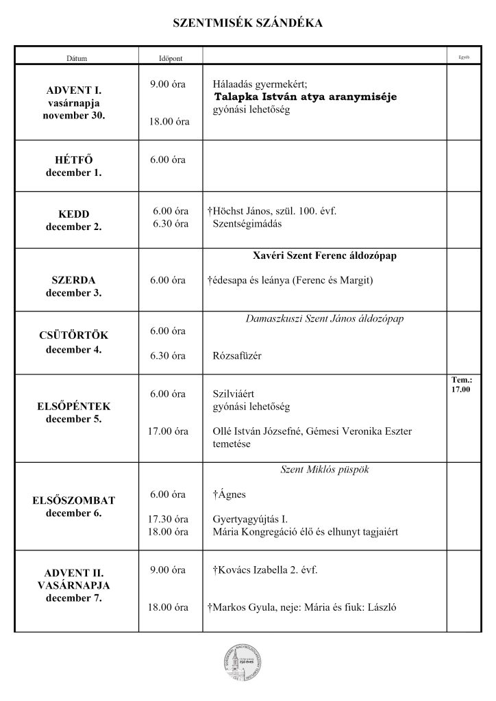 • Miserend – november 30 – december 7.