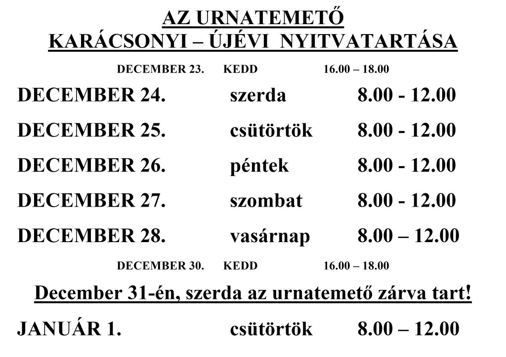 • Urnatemető karácsonyi – újévi nyitvatartása