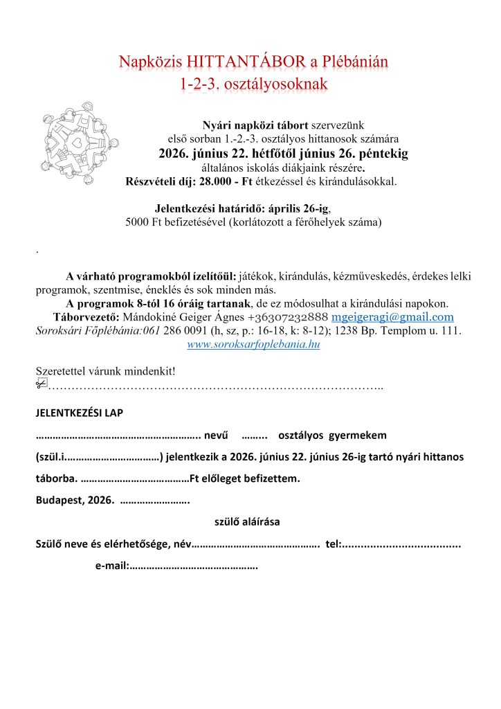 • Napközis HITTANTÁBOR a Plébánián 1-2-3. osztályosoknak