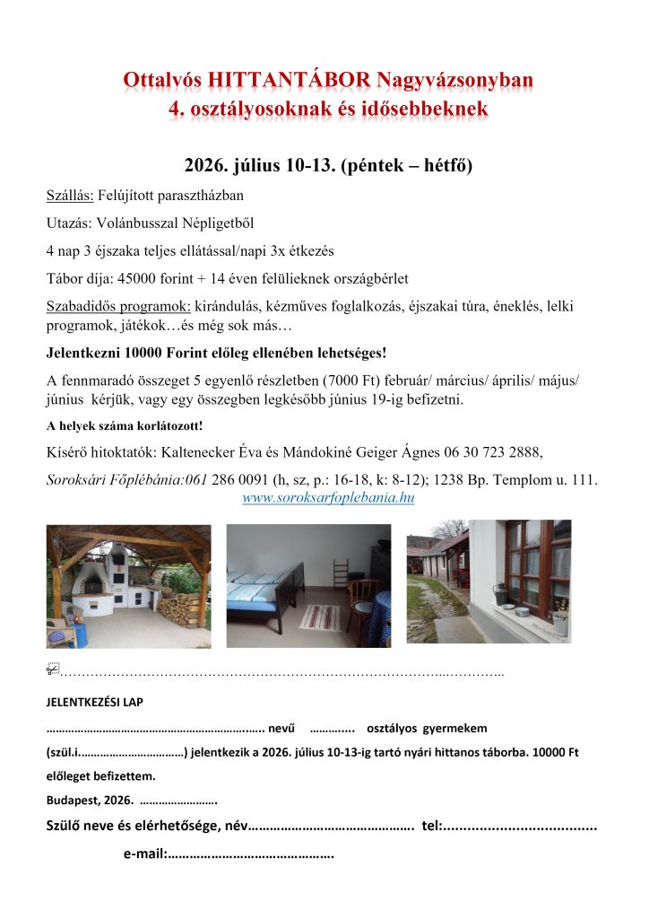 • Ottalvós HITTANTÁBOR Nagyvázsonyban 4. osztályosoknak és idősebbeknek