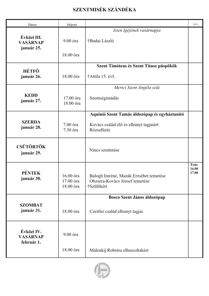 • Miserend – január 25 – február 1.