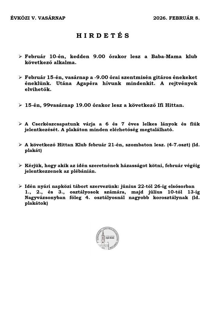 • Hirdetés – Évközi 5. vasárnap