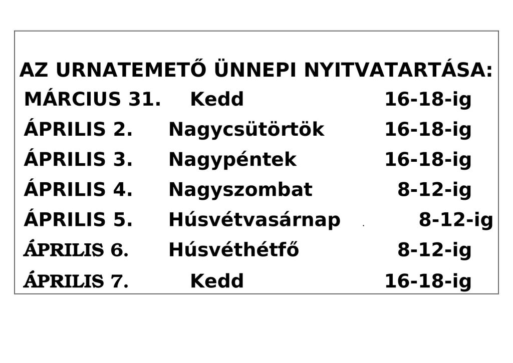 • Urnatemető ünnepi nyitvatartása – Húsvét