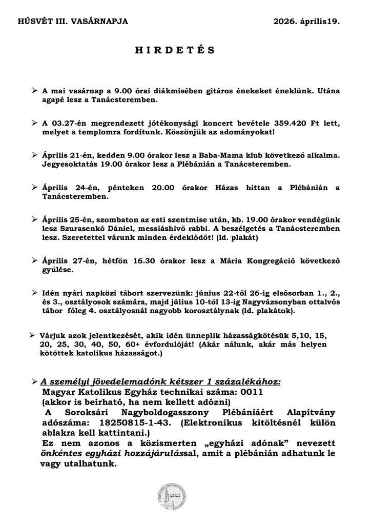 • Hirdetés – Húsvét 3. vasárnapja